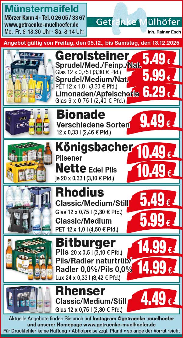 In unserem gut sortierten Abholmarkt bieten wir Ihnen alle gängigen Marken an Fass-, und Flaschenbieren, Limonaden, Mineralwässern, Säften, Spirituosen sowie regionale Weine an.